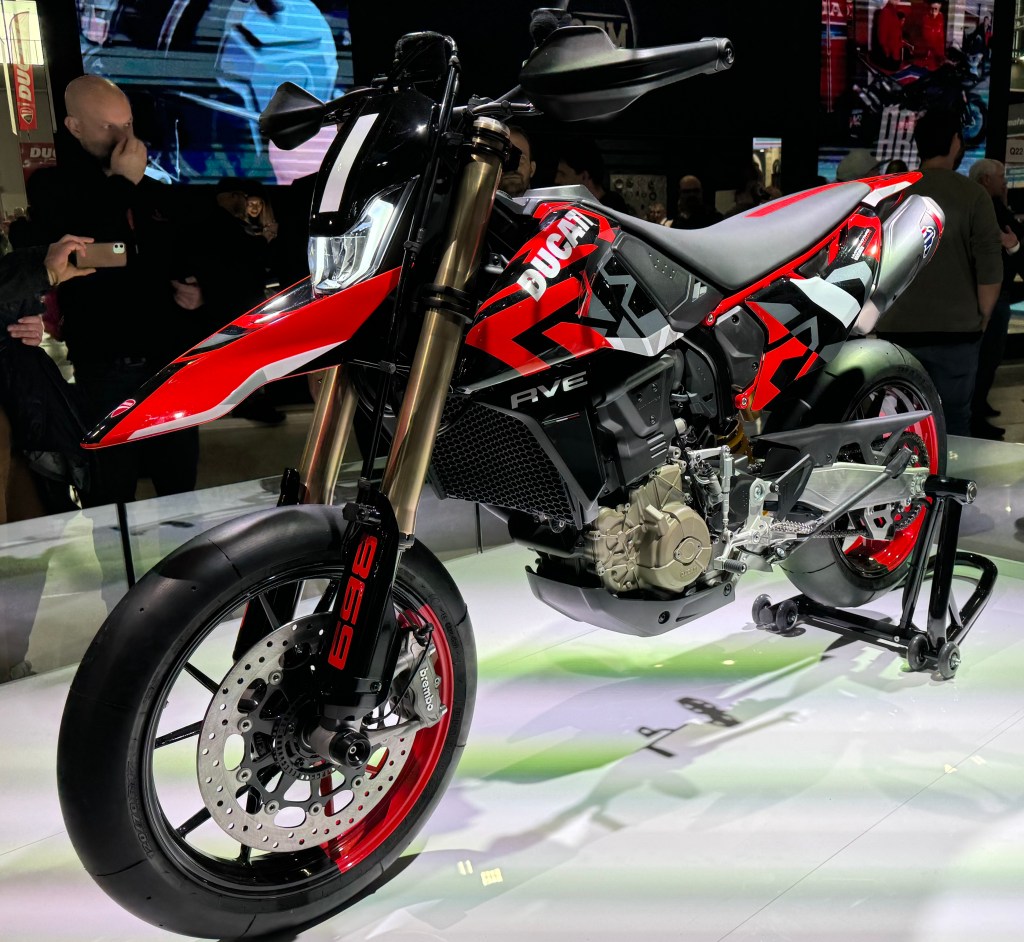 - la Hypermotard 698 Mono, con el motor Superquadro Mono, que mantiene su carácter de máquina muy divertida, ligera, potente, y sofisticada, como todas las Ducati. La verdad es que, en directo, la decoración es todavía más espectacular:.