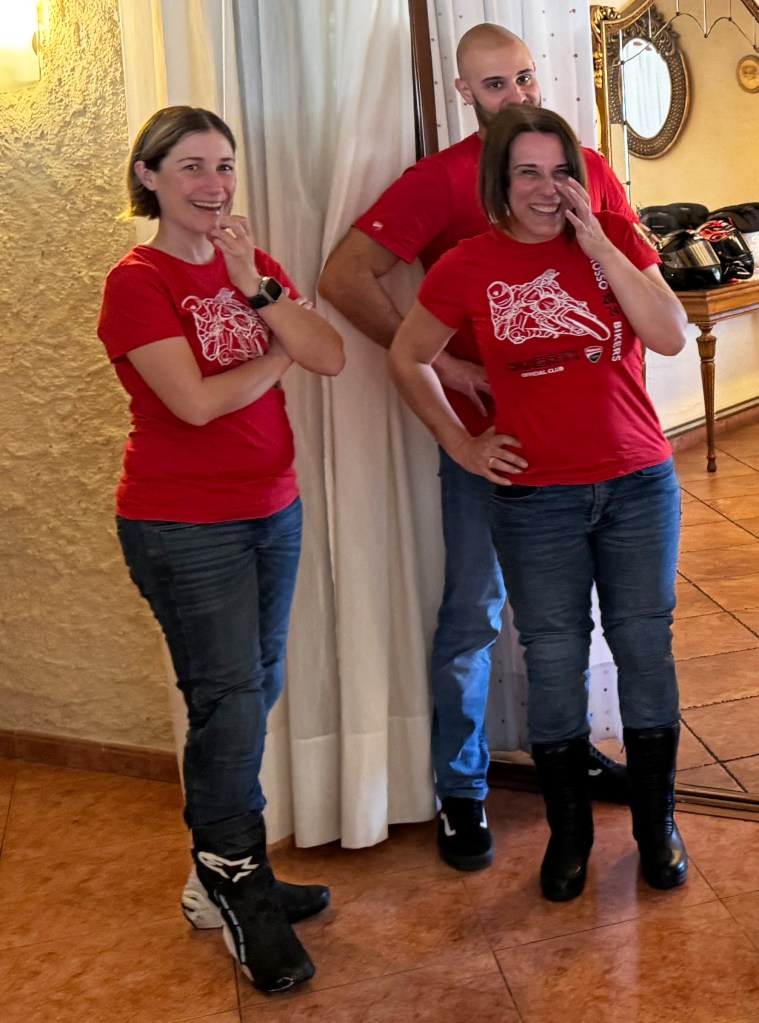 Sin más, los escapes de todas nuestras Ducatis comenzaron a rugir. Aunque ya ha pasado otras veces, no deja de ser curioso que antes, durante, y después del almuerzo, la gente del lugar no paró de hacer fotos y preguntar detalles de nuestras máquinas… no es para menos, no? 😉 :
